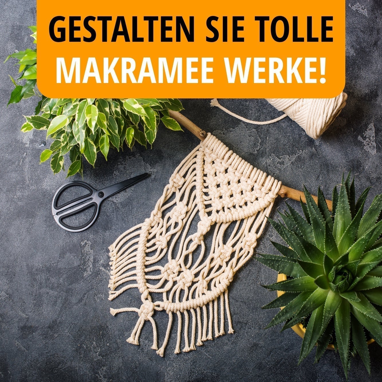 This spool of macrame yarn is made from 100% cotton. It is 3mm thick and with a length of 100m it offers enough material for most DIY projects. It is twisted four times and consists of a total of 44 individual threads so that it can be easily processed.