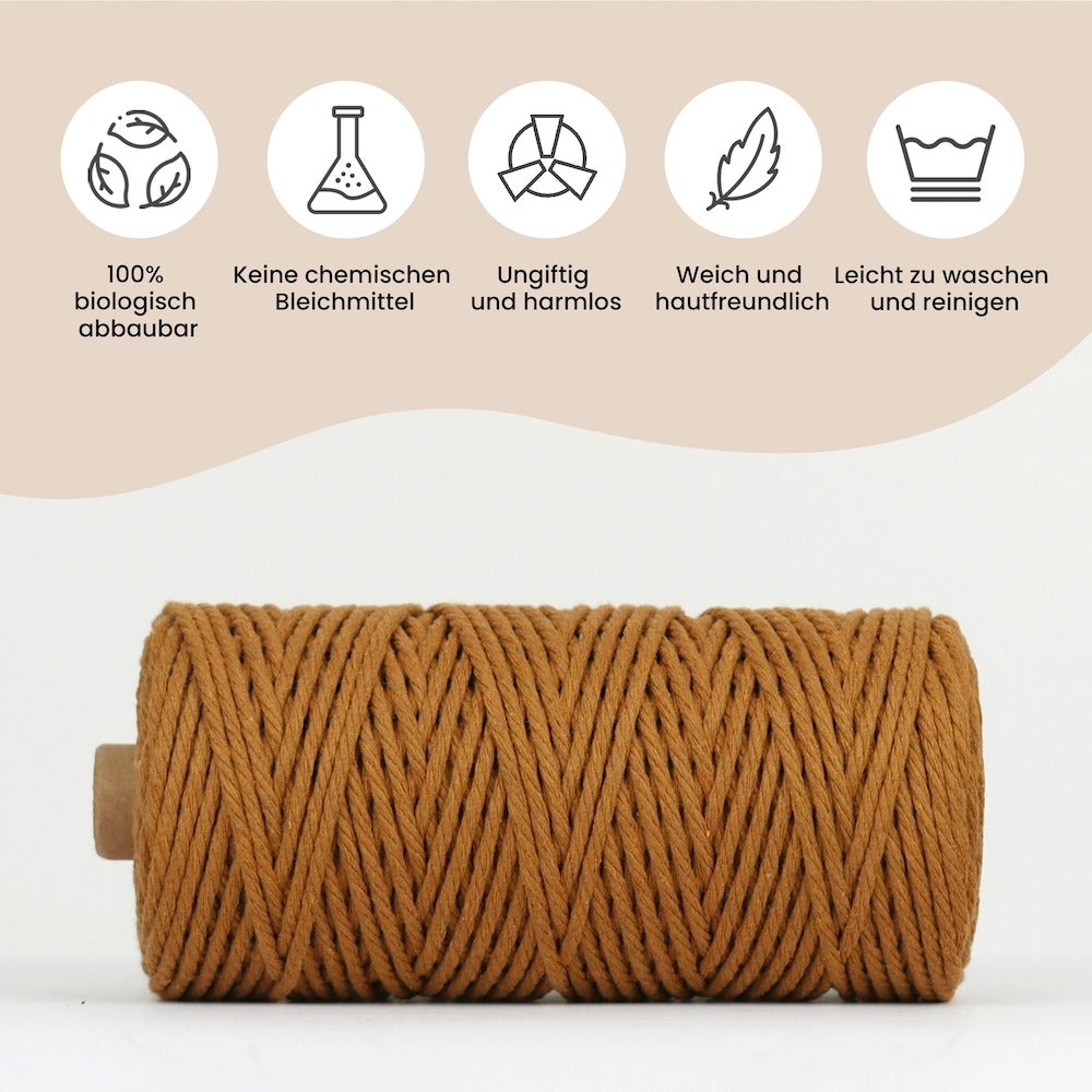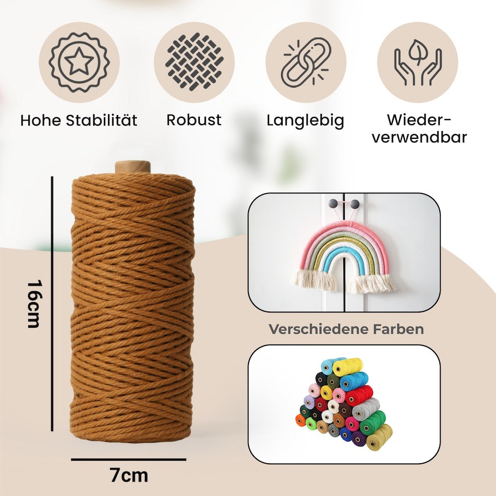 Diese Rolle Makramee-Garn besteht aus 100% Baumwolle. Es ist 3mm dick & bietet mit 100m Länge genug Material für die meisten DIY Projekte. Es ist 4-fach gedreht und besteht aus insgesamt 44 einzelnen Fäden, damit es sich gut verarbeiten lässt.