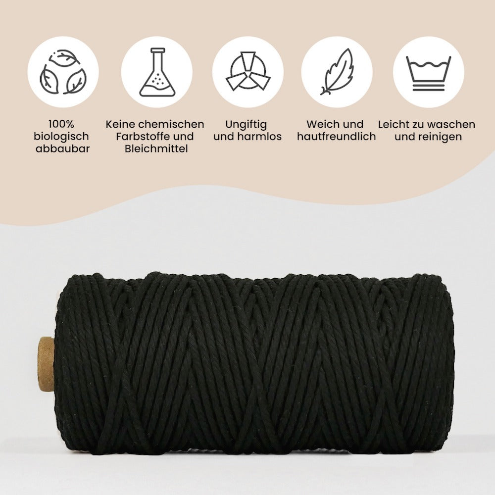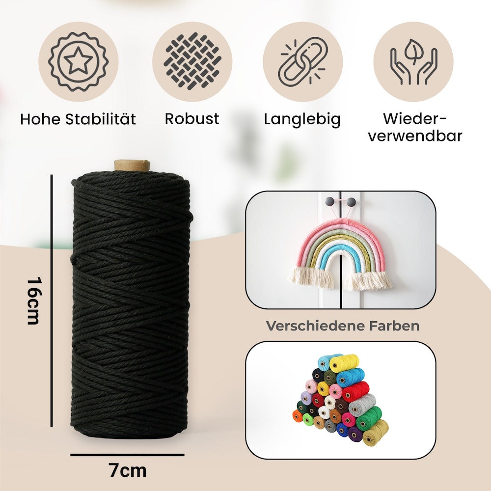 Diese Rolle Makramee-Garn besteht aus 100% Baumwolle. Es ist 3mm dick & bietet mit 100m Länge genug Material für die meisten DIY Projekte. Es ist 4-fach gedreht und besteht aus insgesamt 44 einzelnen Fäden, damit es sich gut verarbeiten lässt.